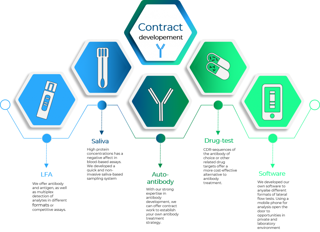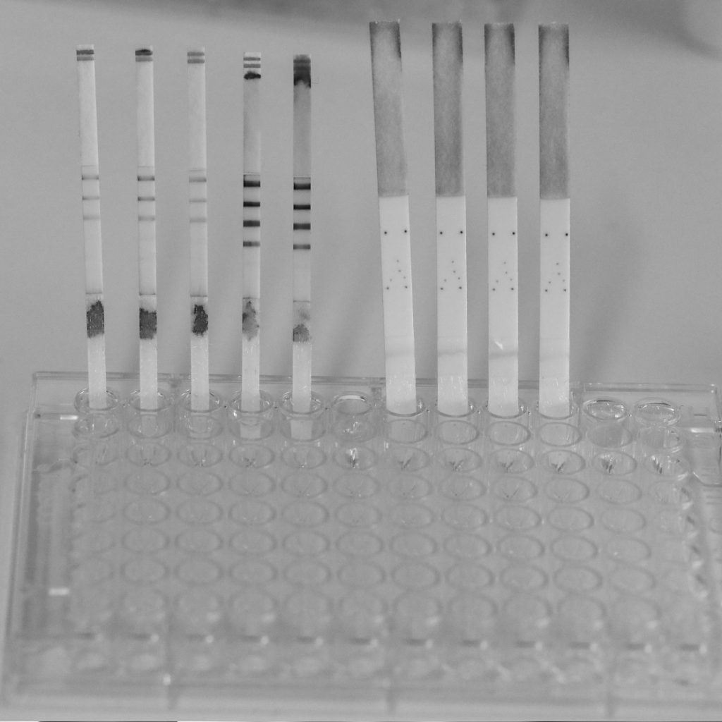 While our own research is focused on the detection of low amounts of autoantibodies in body fluids (in AMD/eye diseases), we are not restricted to detect antibodies. Furthermore, we can offer antibody and antigen detection, as well as multiplex detection of analytes in different formats or competitive assays, to meet all requirements of your lateral flow assay.